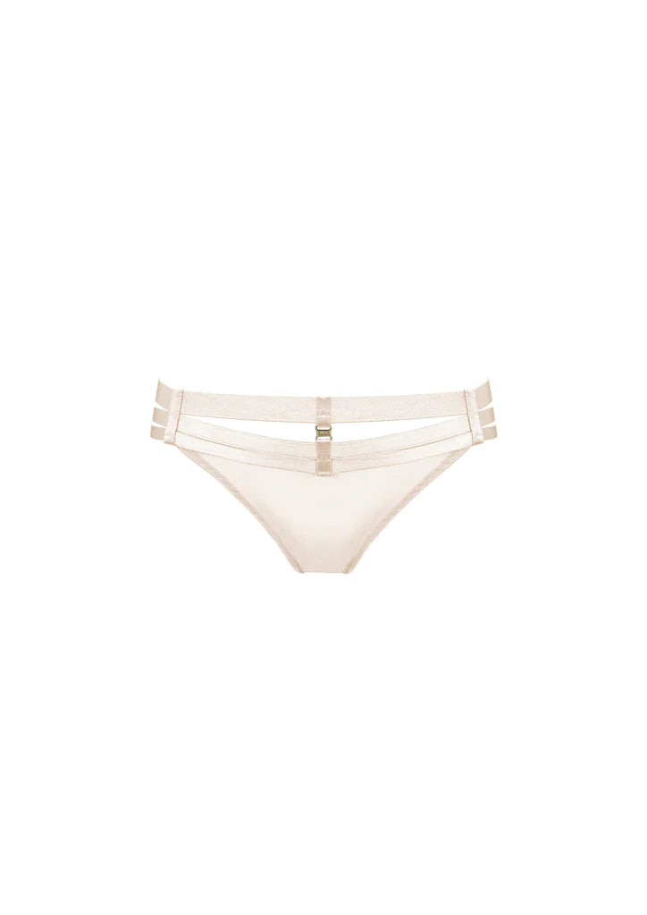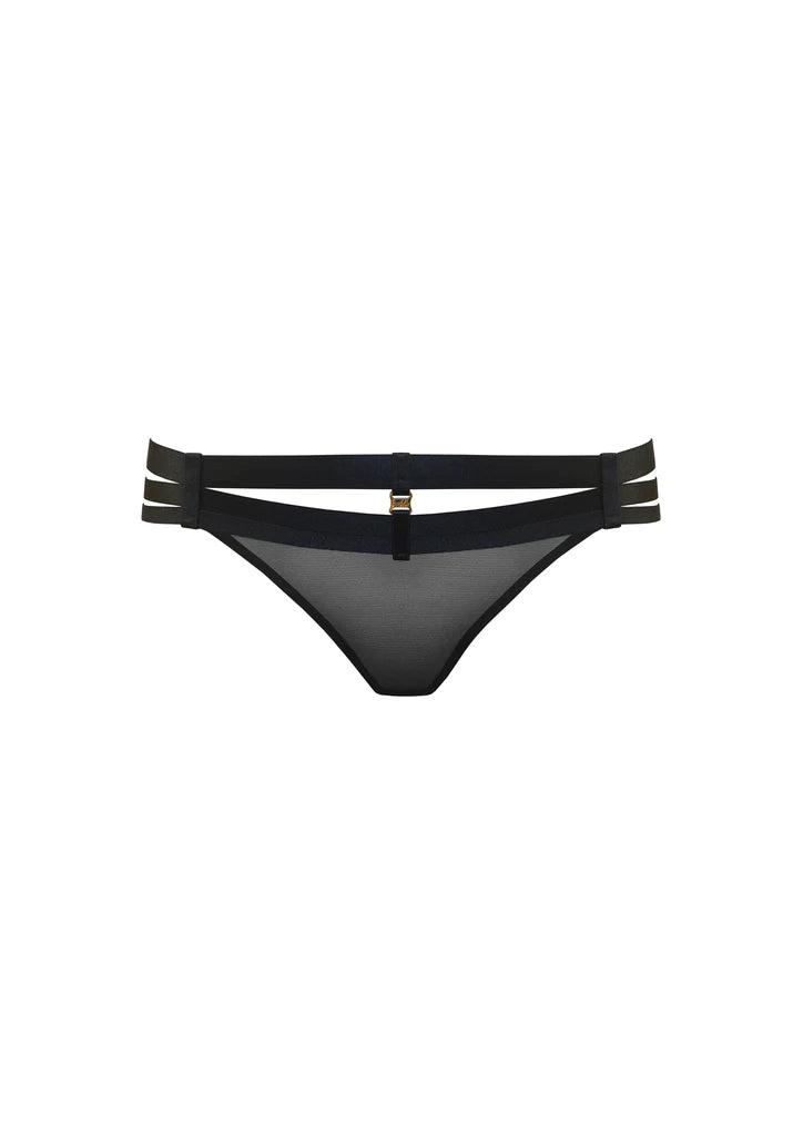 True Bordelle aesthetic in an everyday thong, made from soft stretch mesh and Signature satin elastic strapping, this style is fully adjustable on the hip and finished with 24k gold plated hardware.