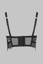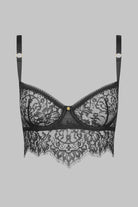 Corbeille bra with underwiring teaming a stiff Gothic lace with Swiss dot mesh. Wide, adjustable elasticated straps for perfect support. Adjustable hook-and-eye fastening on the back. A haunting piece of lingerie that is iconic of the Inspiration Divine collection.