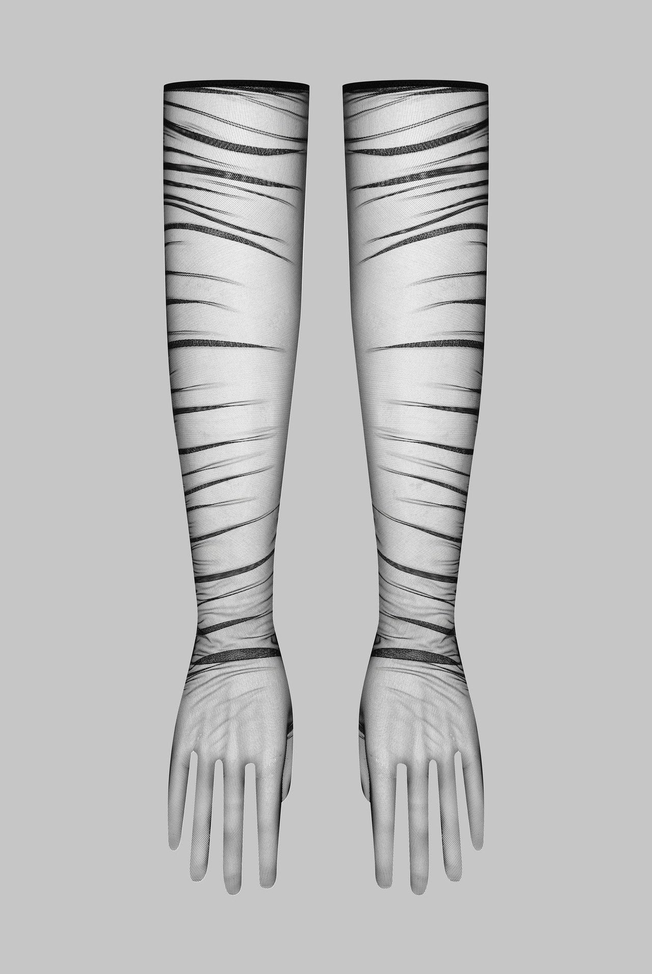 Opera gloves made of a very transparent tulle. Seam pleated set that fully structures your hands and forearms in style.