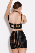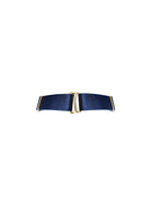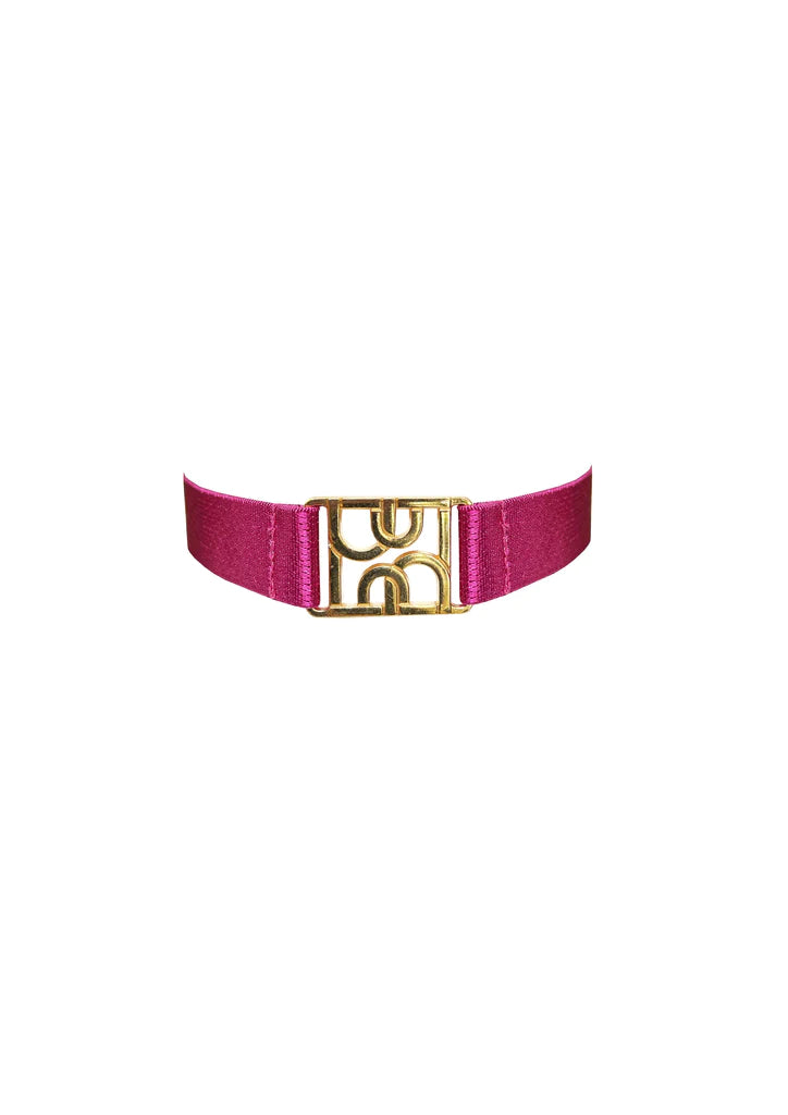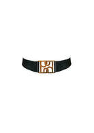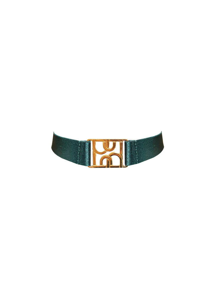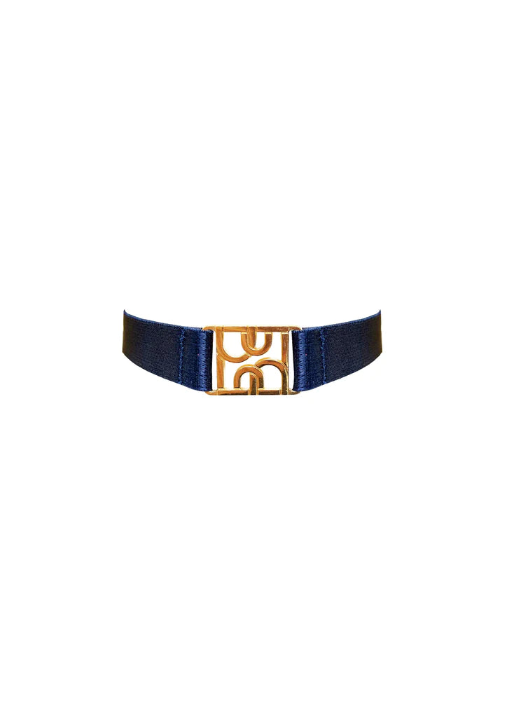 A satin elastic strap collar featuring our 24k gold plated monogram component. This fully adjustable collar is the perfect finishing touch to any new season look.