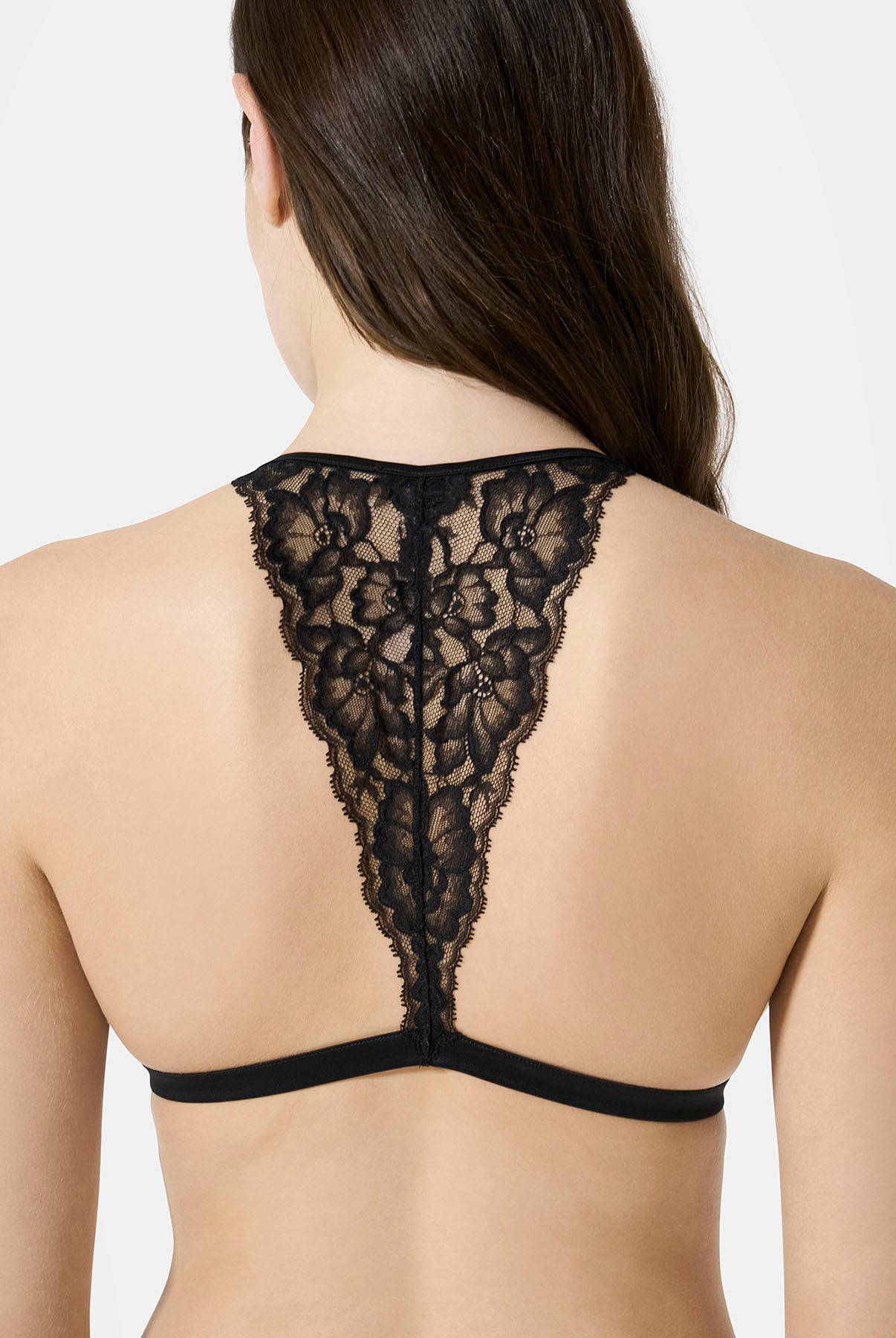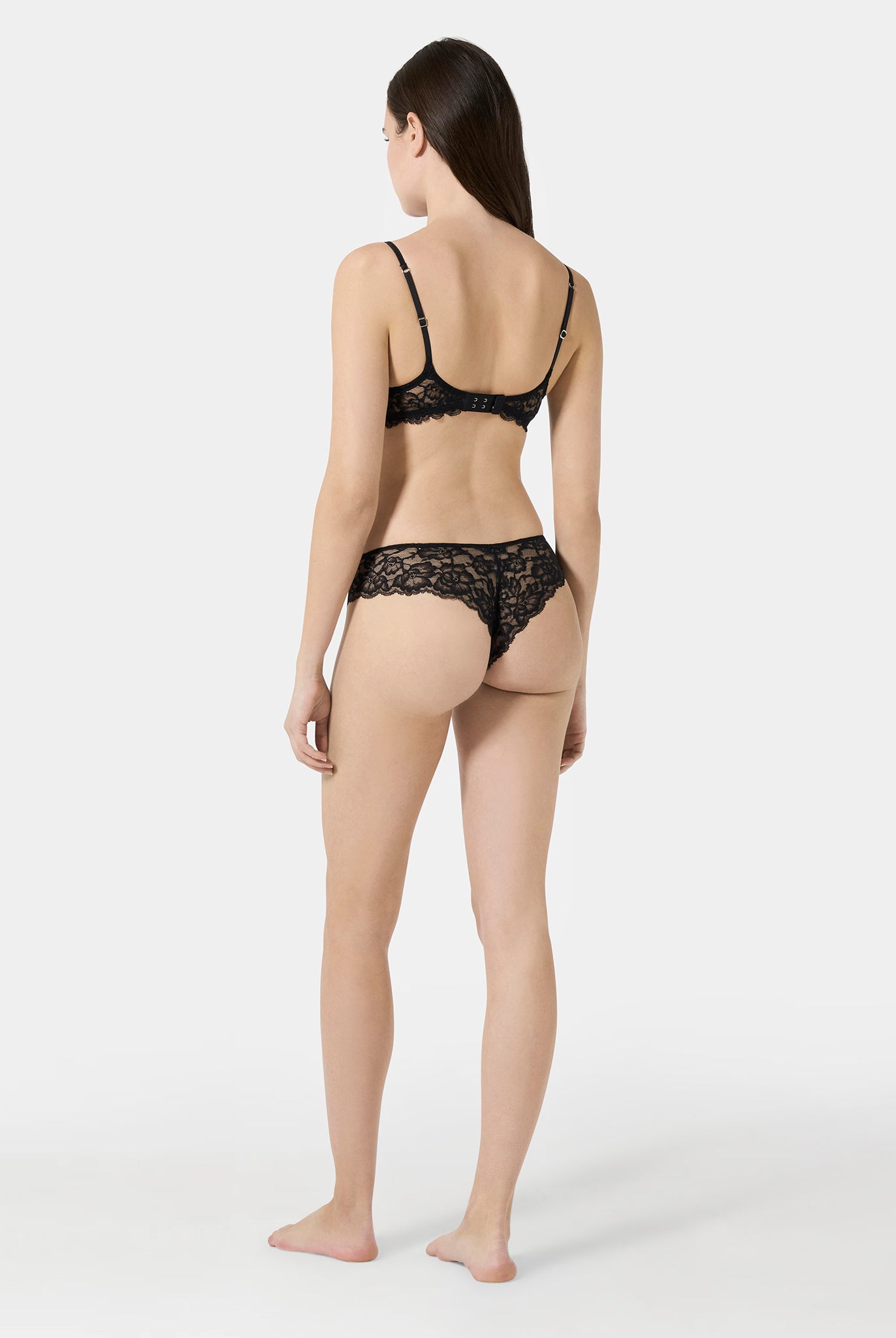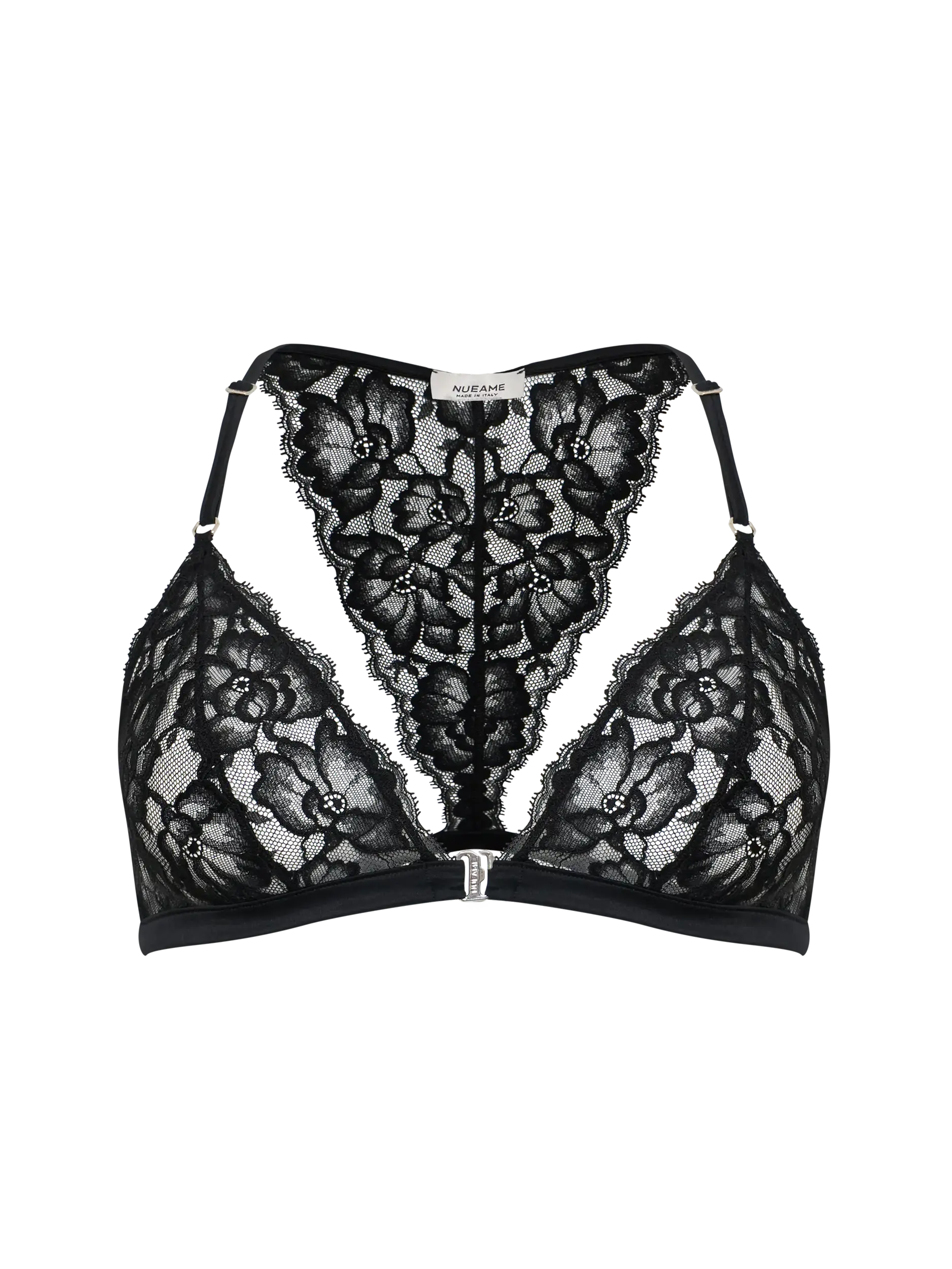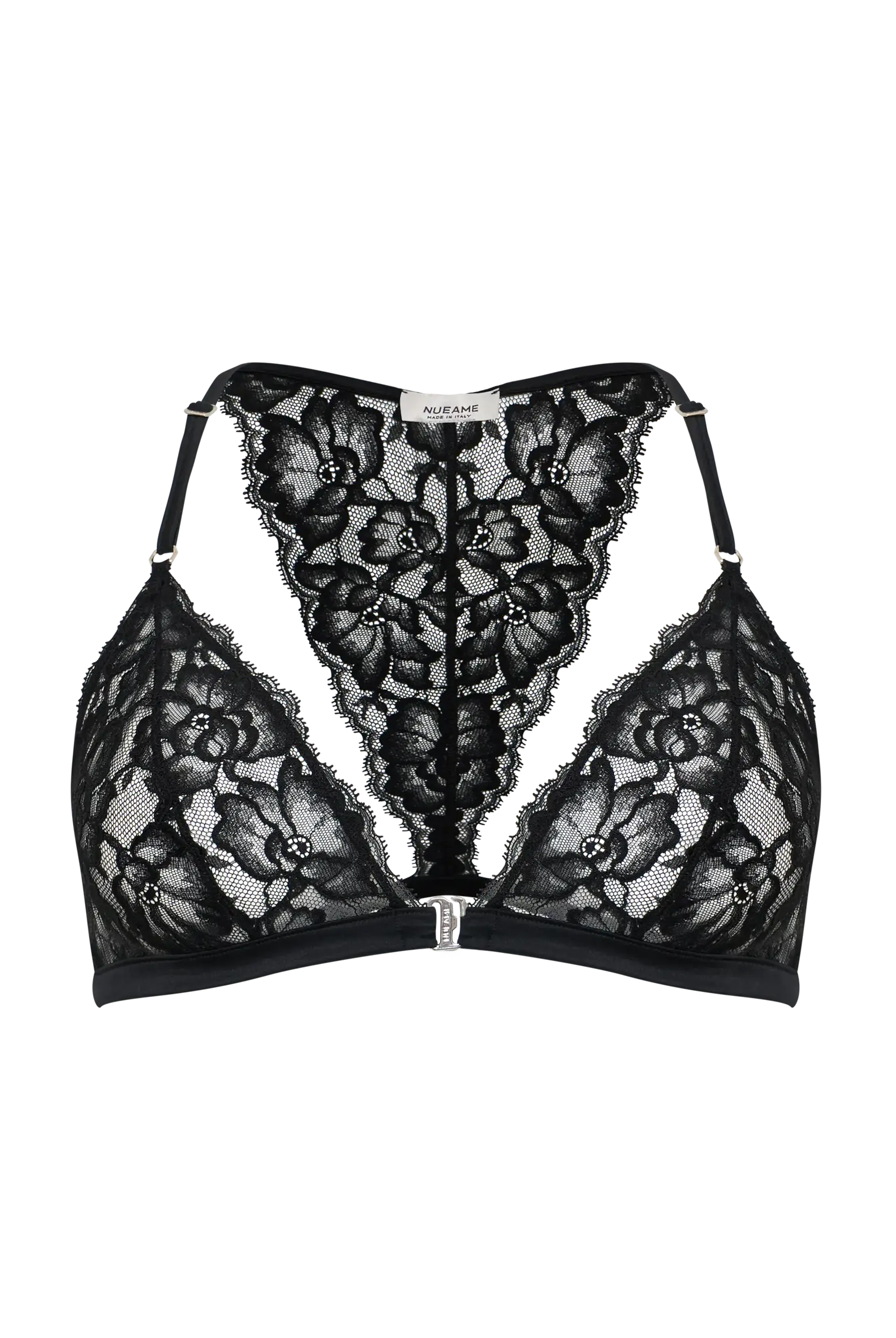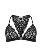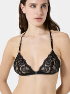 Triangle bra in Leavers lace with a front metal clasp and a fully lace back. An elegant and sensual design that blends refined sheerness with contemporary details. Lightweight and comfortable, it embraces the silhouette with delicacy, enhancing femininity in a natural way.