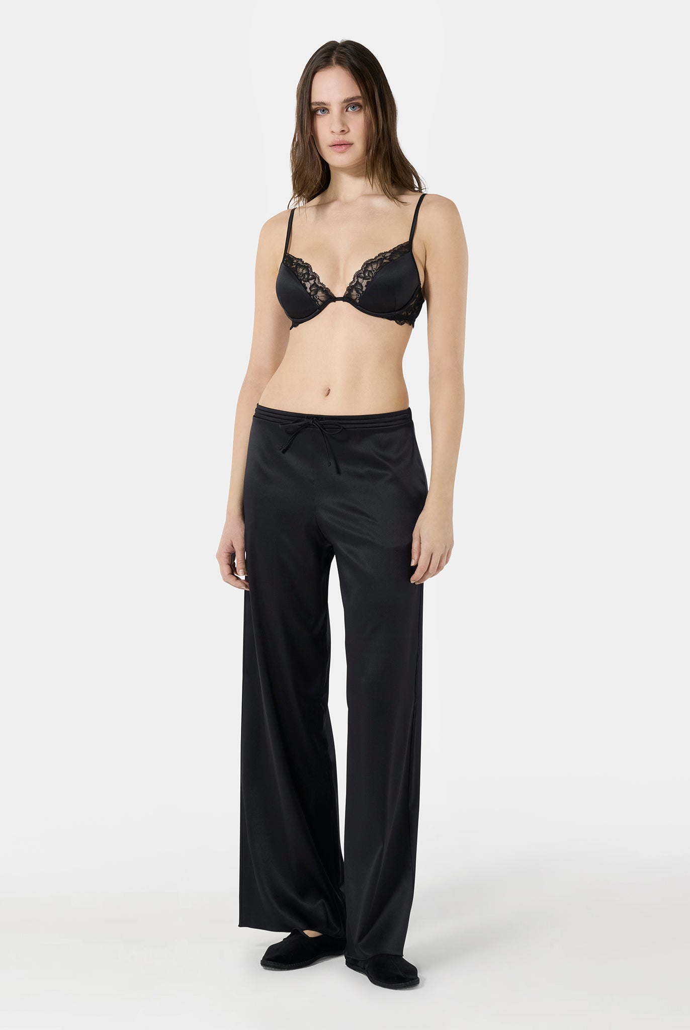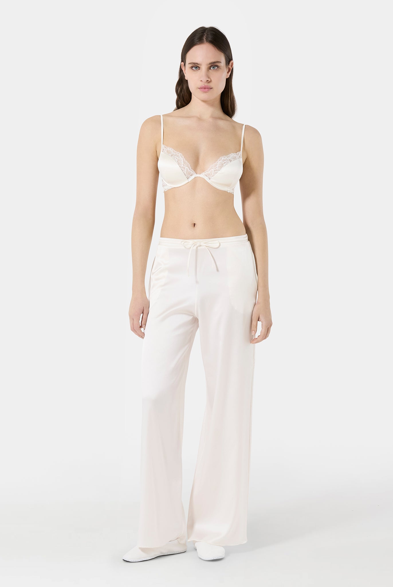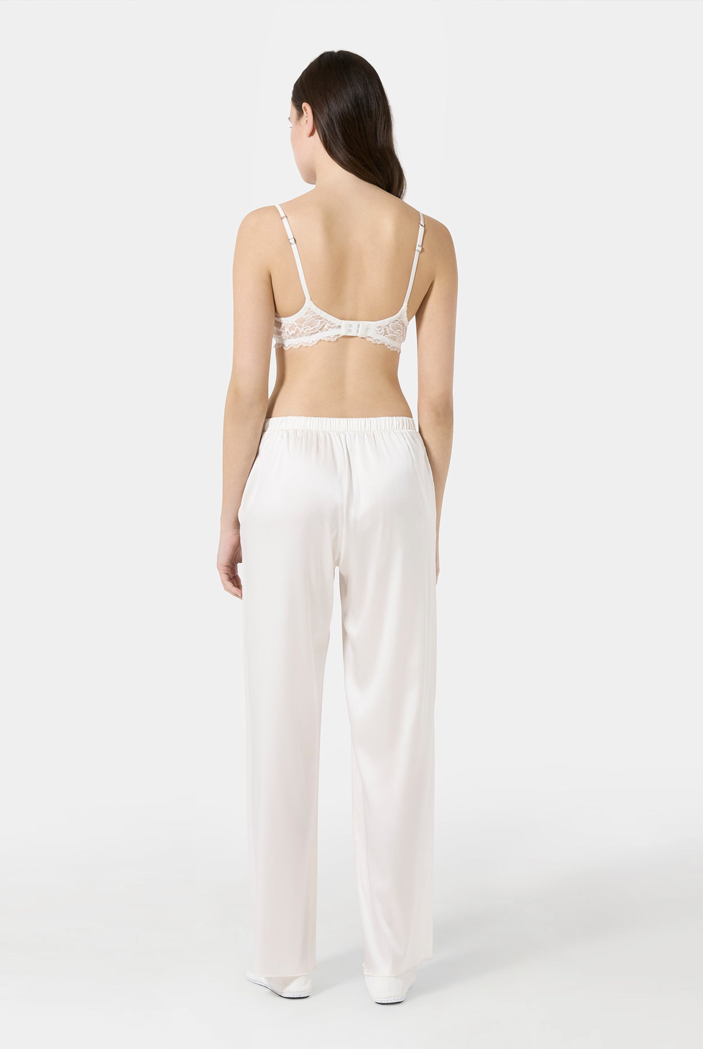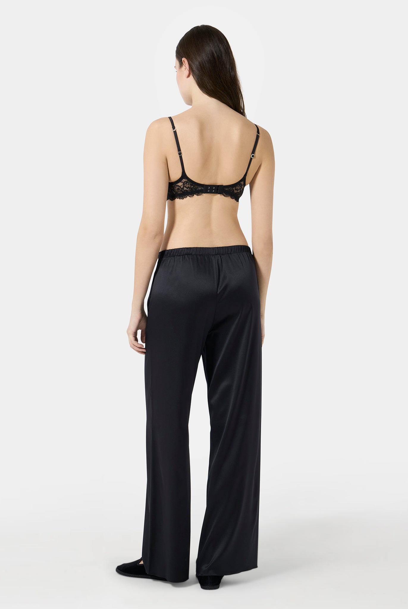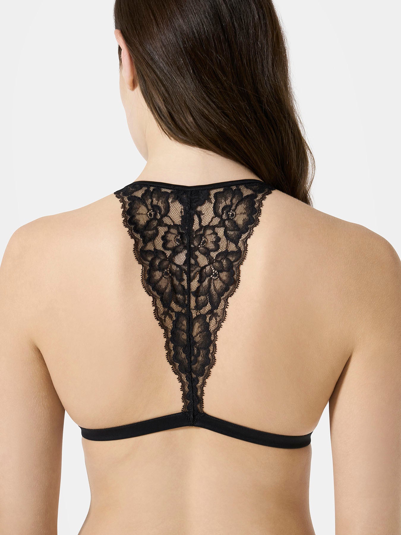 Triangle bra in Leavers lace with a front metal clasp and a fully lace back. An elegant and sensual design that blends refined sheerness with contemporary details. Lightweight and comfortable, it embraces the silhouette with delicacy, enhancing femininity in a natural way.