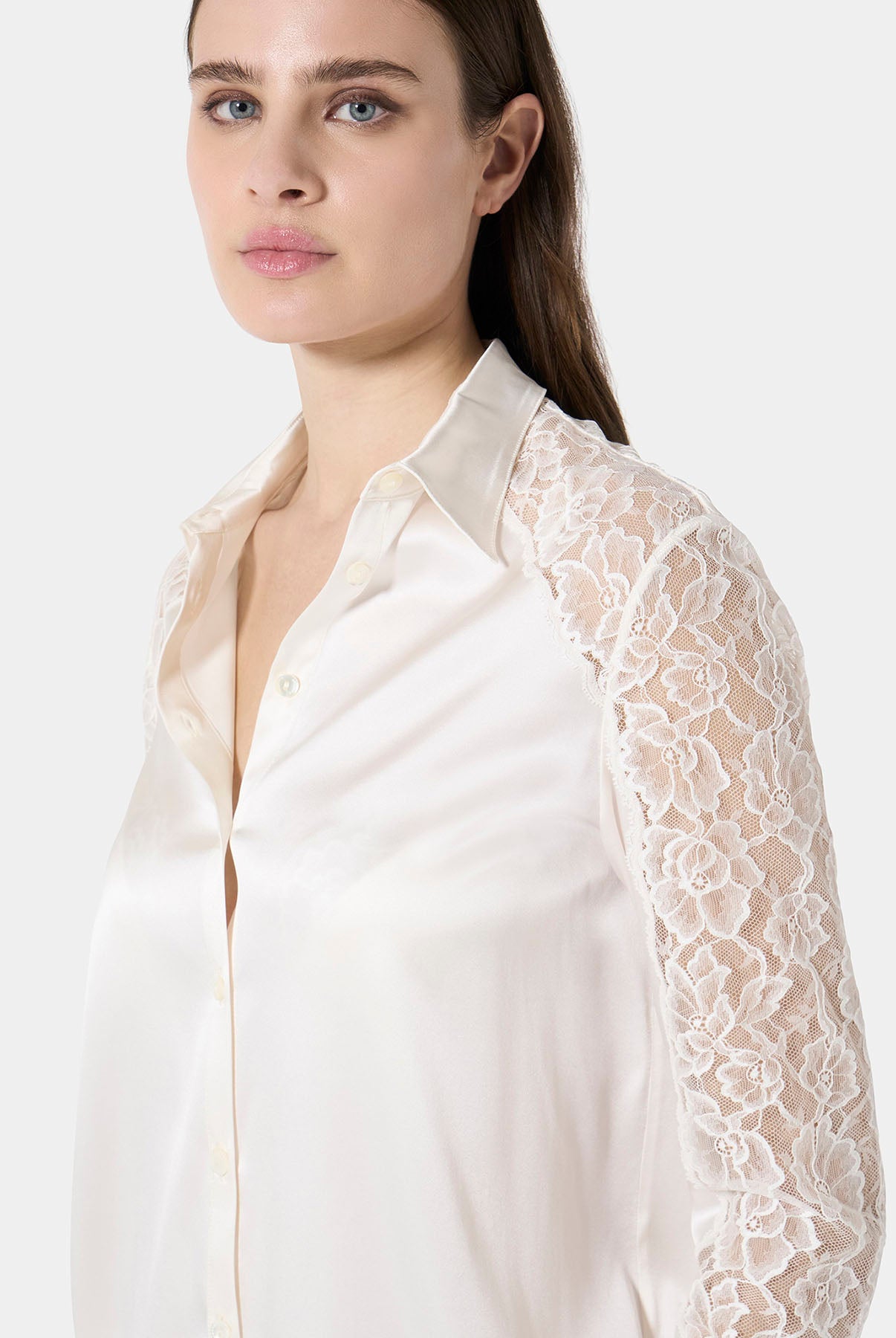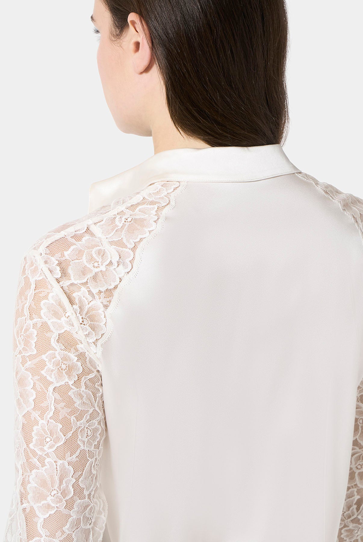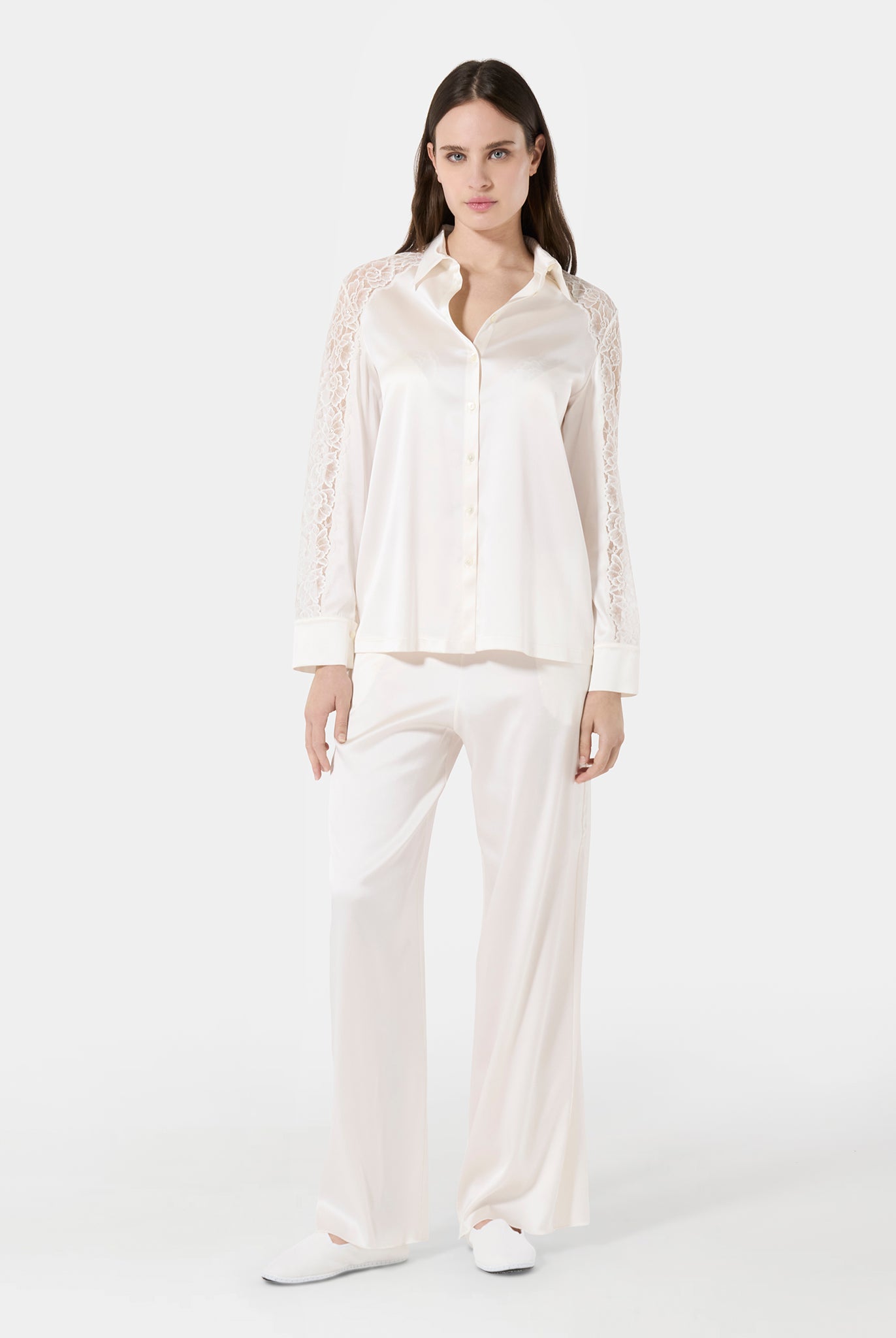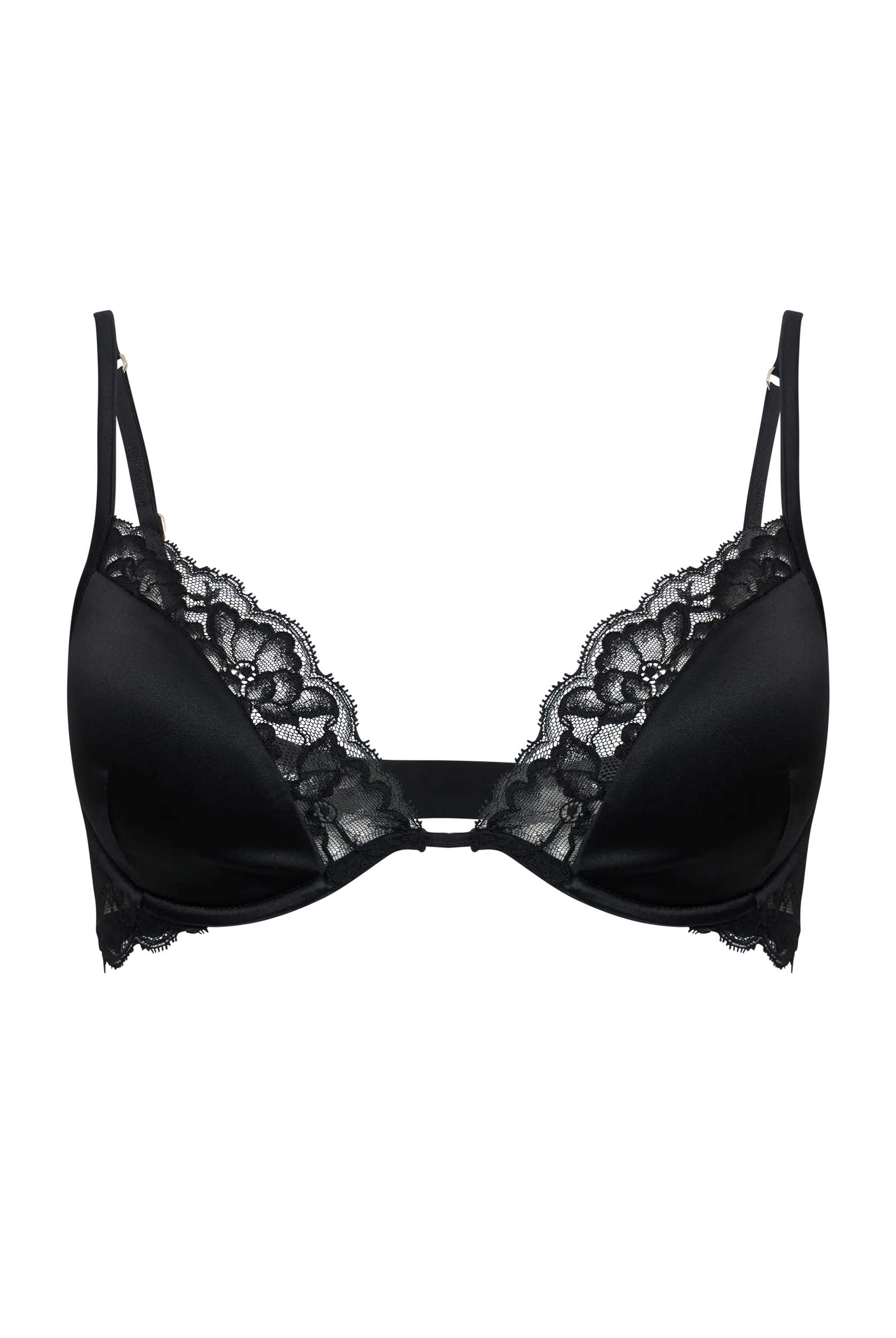 Triangle bra in Leavers lace with a front metal clasp and a fully lace back. An elegant and sensual design that blends refined sheerness with contemporary details. Lightweight and comfortable, it embraces the silhouette with delicacy, enhancing femininity in a natural way.
